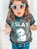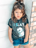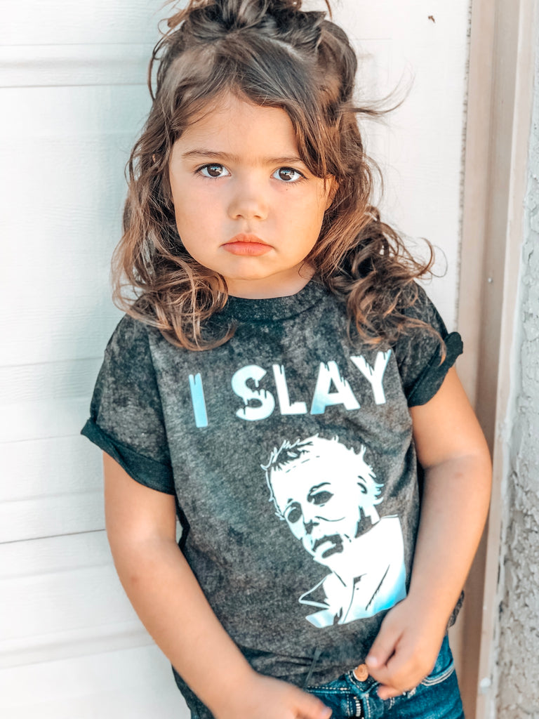 I Slay Halloween Jason Vorhees Friday The 13th inspired T shirt for Infant, Toddler Kids and Adults. Can be Done with or without the Bleach wash detail.